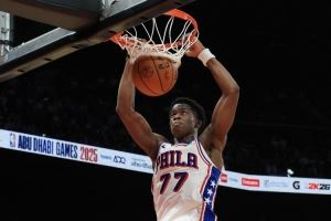 接着,在贾巴里-沃克补篮得手后,埃奇库姆命中了他个人的第三记三分球,在比赛还剩1分14秒时将比分追至25平。在首节比赛中,76人最后的16分里有13分是由他得到的。