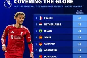 英超各国外援数:法国40人、荷兰36人、巴西31人、西班牙21人